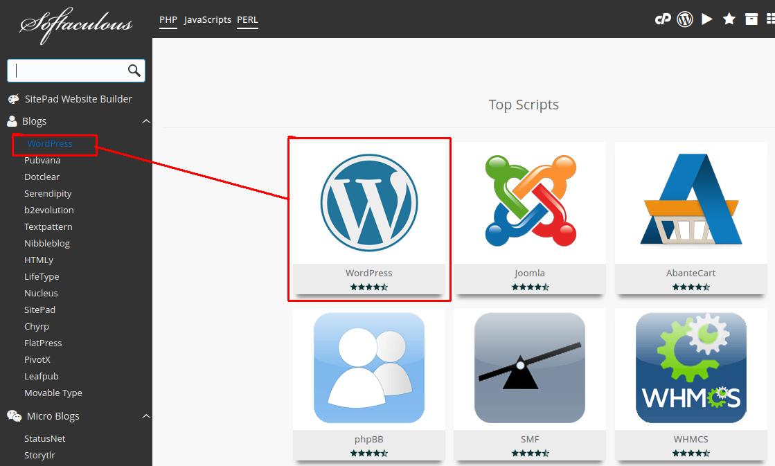 - After opening the 'Softaculous Apps Installer' application, you will be welcomed by a 'Top Scripts' page for the recommended & most used websites, such as WordPress, Joomla, phpBB & more! There is also a well-categorised list of websites. You are welcome to browse through them, however for this tutorial I will be installing WordPress. Select 'WordPress' to install it.